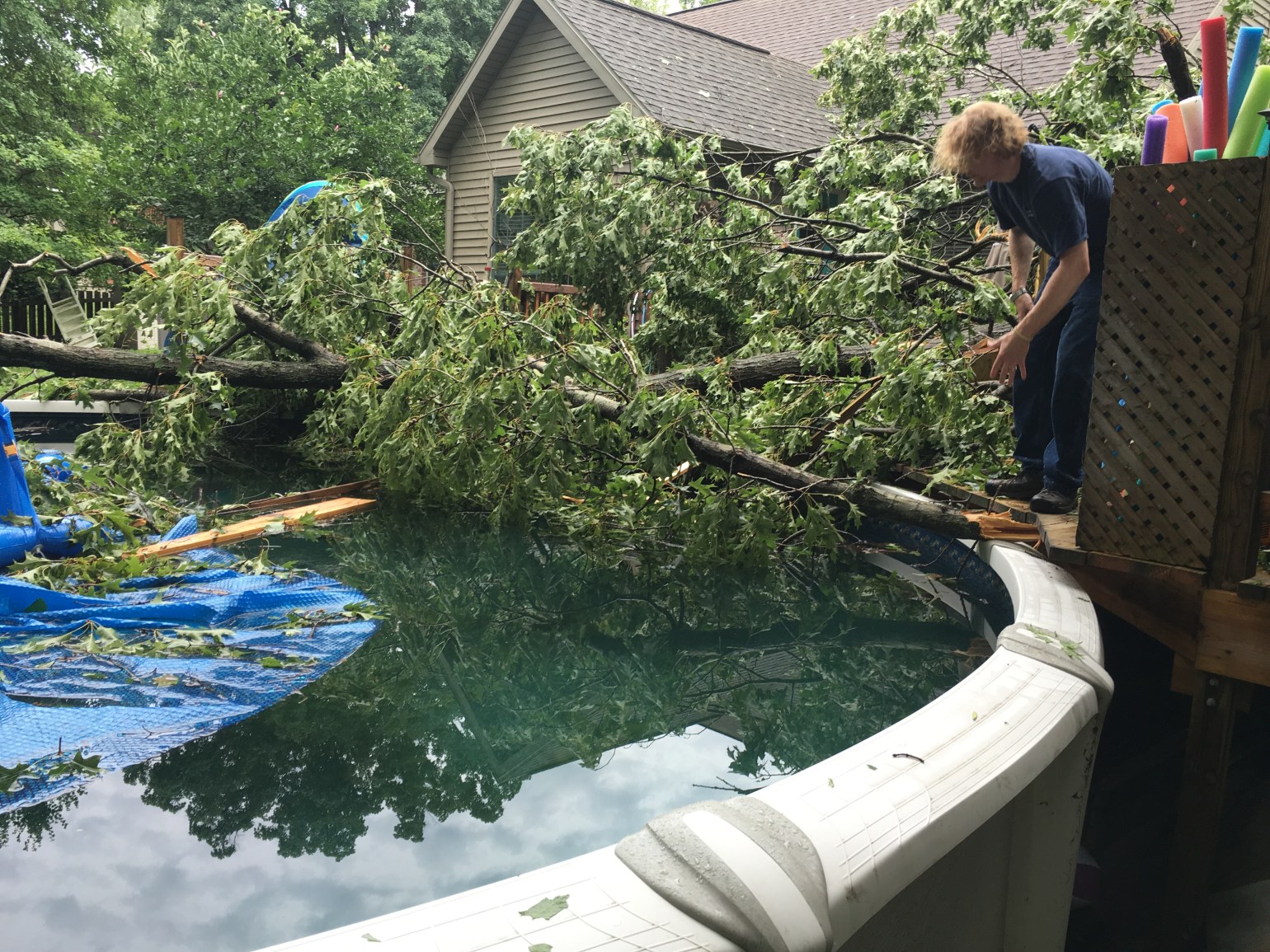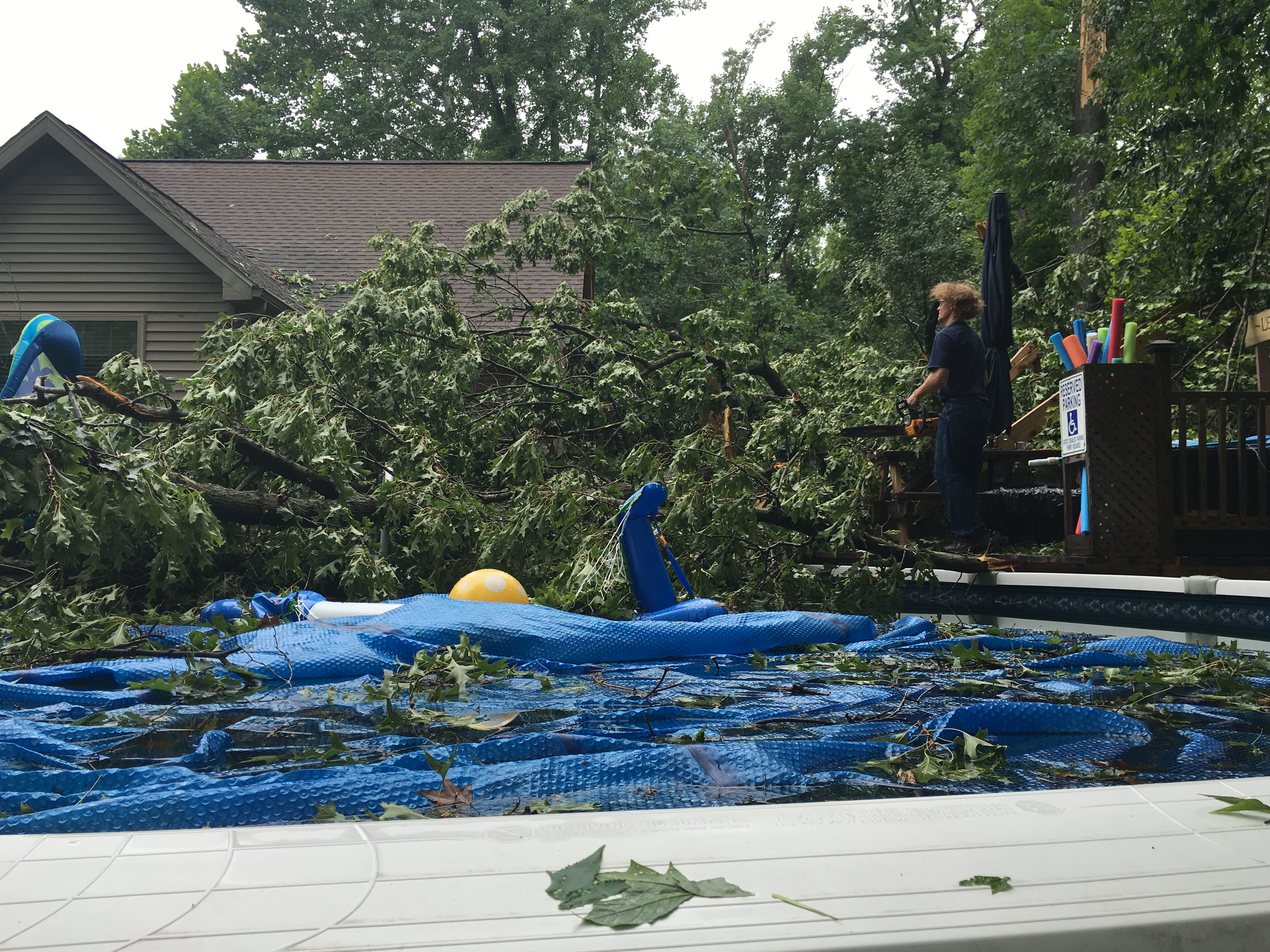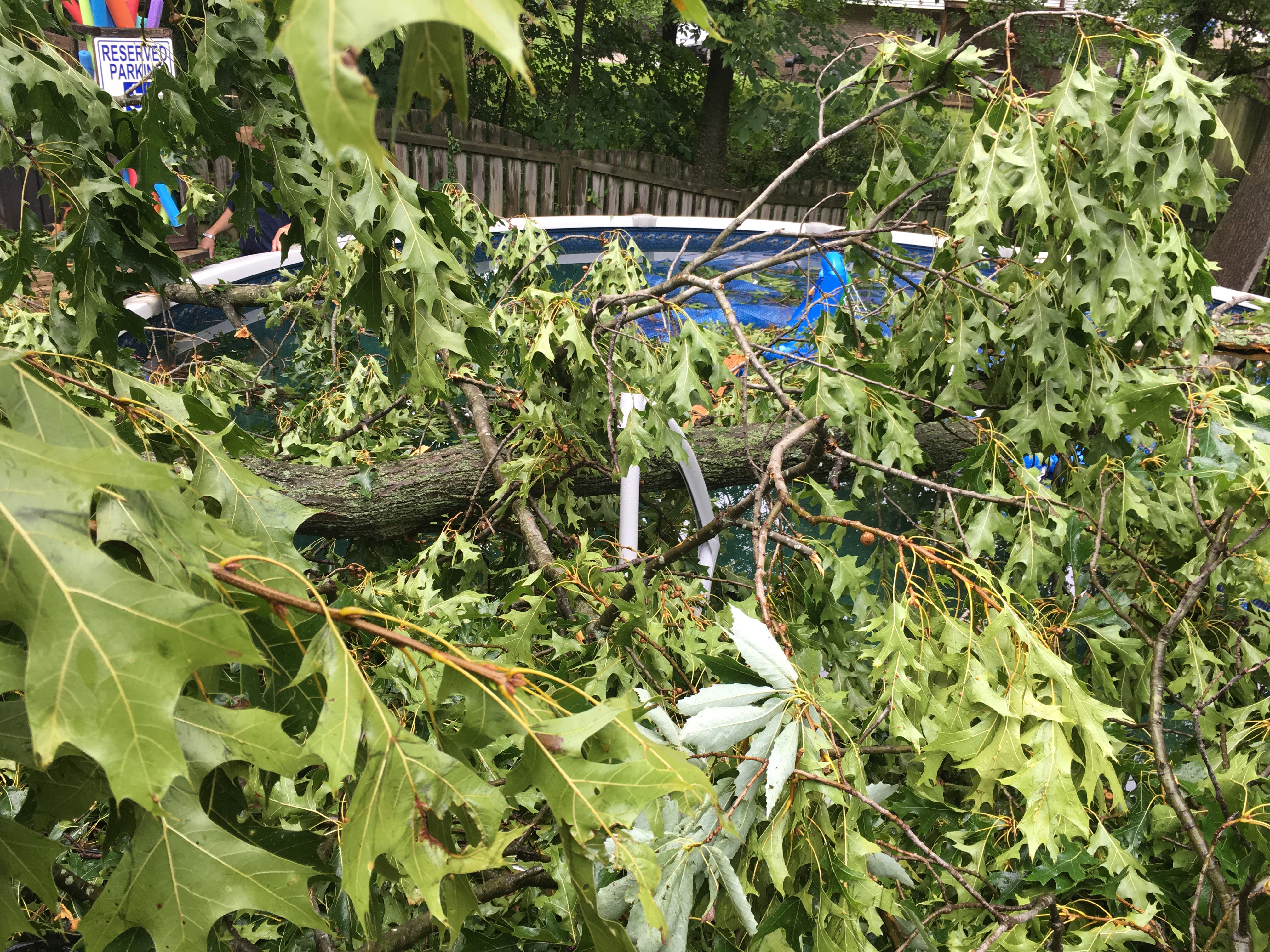 I’ve never ever lived through a natural disaster that has caused insane damage to my property or a house fire like my husband. I have never had to be on the phone with insurance people, and it not be about Bailynn, for hours on end. I have not had one instance change so many things for me, other than Bailynn being born, but Thursday July 7, 2016 will be a date I will NEVER forget. Shortly after my friend JoElle and her girls arrived at our home, to swim and hang out, a swift storm swept through the area. In an instant, a huge oak tree on our property plummeted to the ground causing damage to our roof, Bai’s bedroom window (that praise God is double pained and only broke on the exterior). It murdered (yes, murdered) our fence, pergola, hot tub, deck, pool and grill bar area that Bob just built. One breath – all gone. One moment – 2 years of blood, sweat and tears wiped out. Our back yard paradise gone. Our pool and hot tub are beyond repair. The deck will have to be removed and rebuilt, the pergola looks like sad sticks stuck to the wind with no topper, everything trashed. Glass shards scattered the ground, tree as far as the eye could see. Our determination and time lost. It is so beyond words, beyond loss. If it wasn’t for some truly amazing people coming to help us, we’d still be under a sea of tree, but we have cleared nearly all the debris. We have uncovered the damage beneath, each step another sock in the stomach. Each branch removed revealing more devastation. Our pool. Our hot tub. Our fence. Our roof. Our oasis.