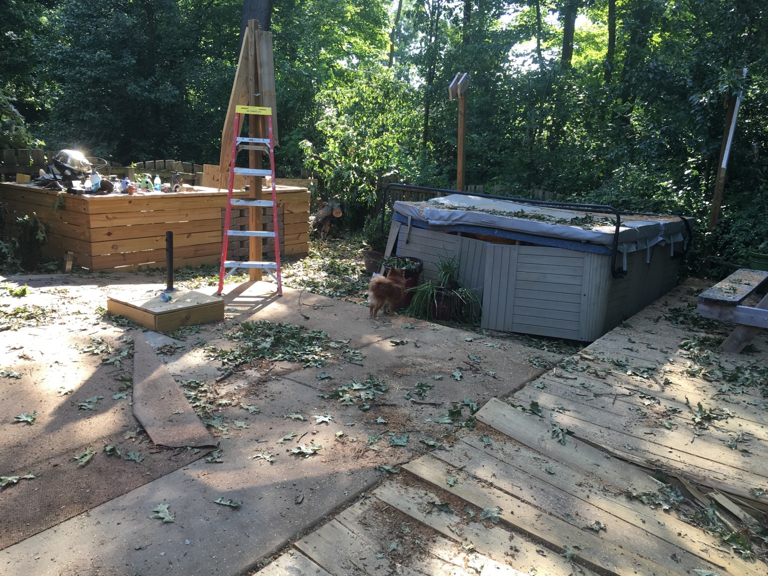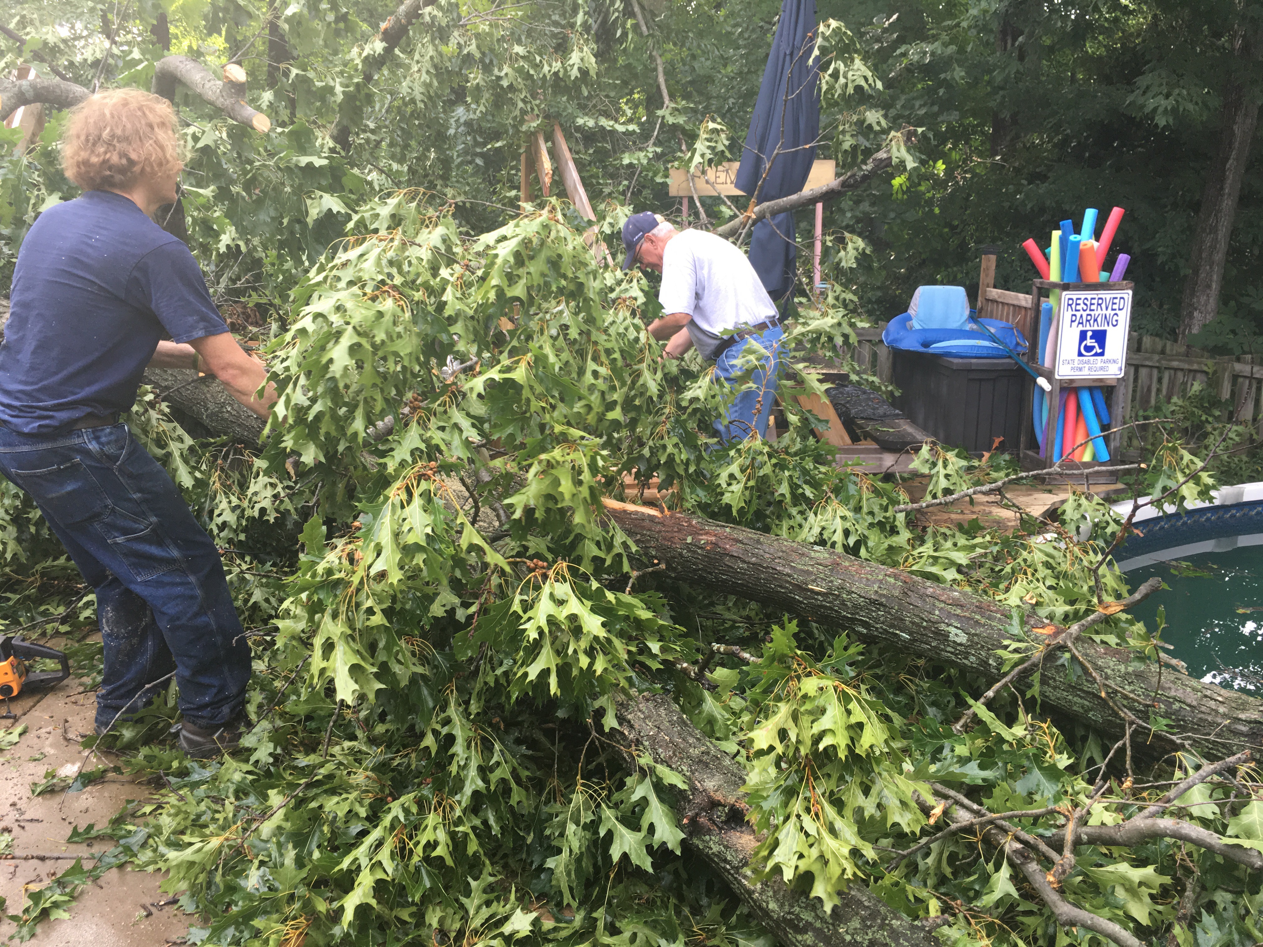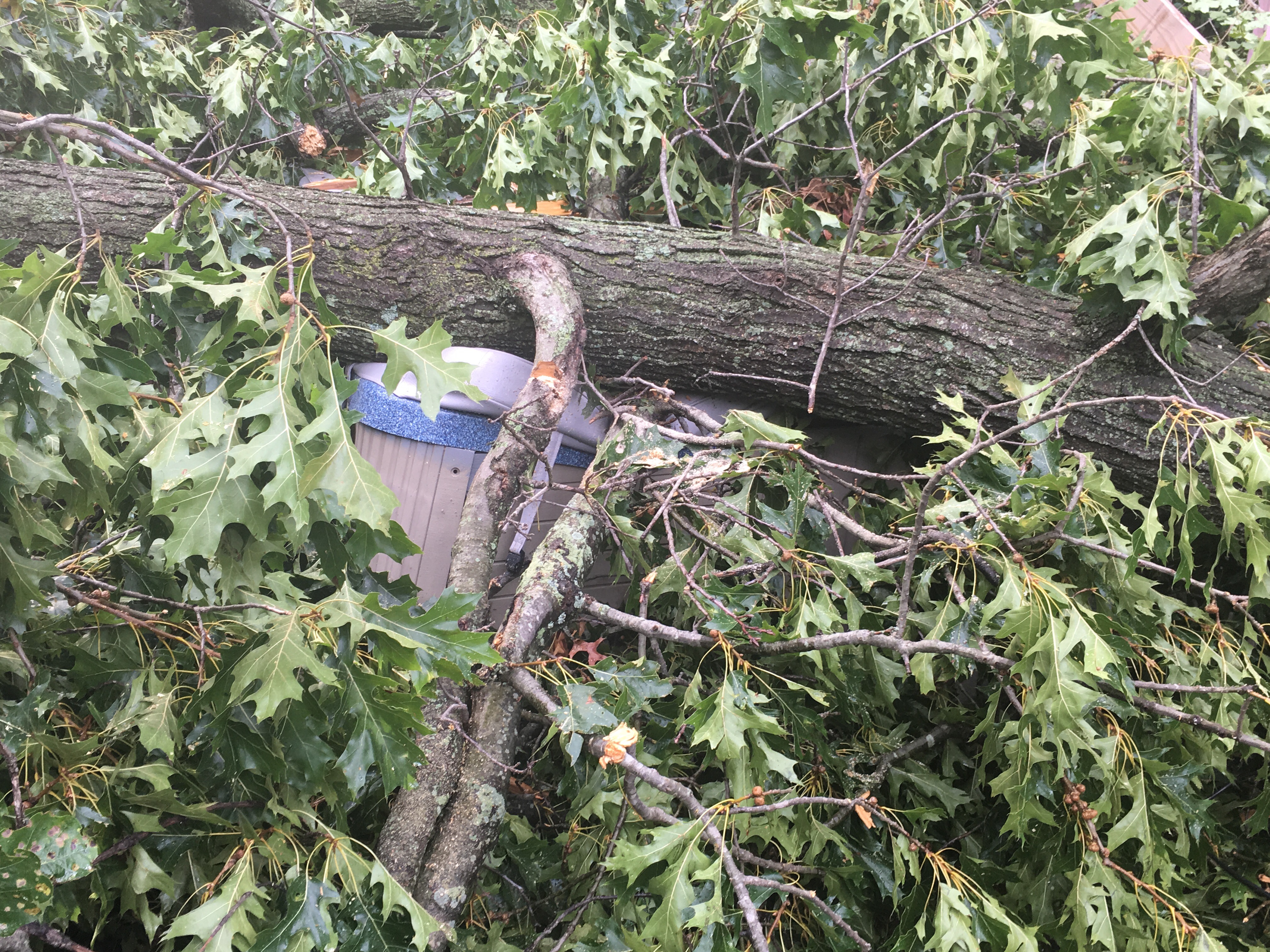 I’ve never ever lived through a natural disaster that has caused insane damage to my property or a house fire like my husband. I have never had to be on the phone with insurance people, and it not be about Bailynn, for hours on end. I have not had one instance change so many things for me, other than Bailynn being born, but Thursday July 7, 2016 will be a date I will NEVER forget. Shortly after my friend JoElle and her girls arrived at our home, to swim and hang out, a swift storm swept through the area. In an instant, a huge oak tree on our property plummeted to the ground causing damage to our roof, Bai’s bedroom window (that praise God is double pained and only broke on the exterior). It murdered (yes, murdered) our fence, pergola, hot tub, deck, pool and grill bar area that Bob just built. One breath – all gone. One moment – 2 years of blood, sweat and tears wiped out. Our back yard paradise gone. Our pool and hot tub are beyond repair. The deck will have to be removed and rebuilt, the pergola looks like sad sticks stuck to the wind with no topper, everything trashed. Glass shards scattered the ground, tree as far as the eye could see. Our determination and time lost. It is so beyond words, beyond loss. If it wasn’t for some truly amazing people coming to help us, we’d still be under a sea of tree, but we have cleared nearly all the debris. We have uncovered the damage beneath, each step another sock in the stomach. Each branch removed revealing more devastation. Our pool. Our hot tub. Our fence. Our roof. Our oasis.
